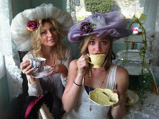 "Entonces Aly & Aj, muy despistadas, se calleron por el pozo.. Compartieron aventuras con la reina blanca, la liebre de marzo y otros de sus compañeros de aquel extraño mundo.. Y luego se fueron a tomar el té con el sombrerero!!" Aquí hay unas locas fotos de Aly & Aj tomando el té como en la nueva película de Tim Burton "Almost Alice" (AMO ESA PELI!!!)..